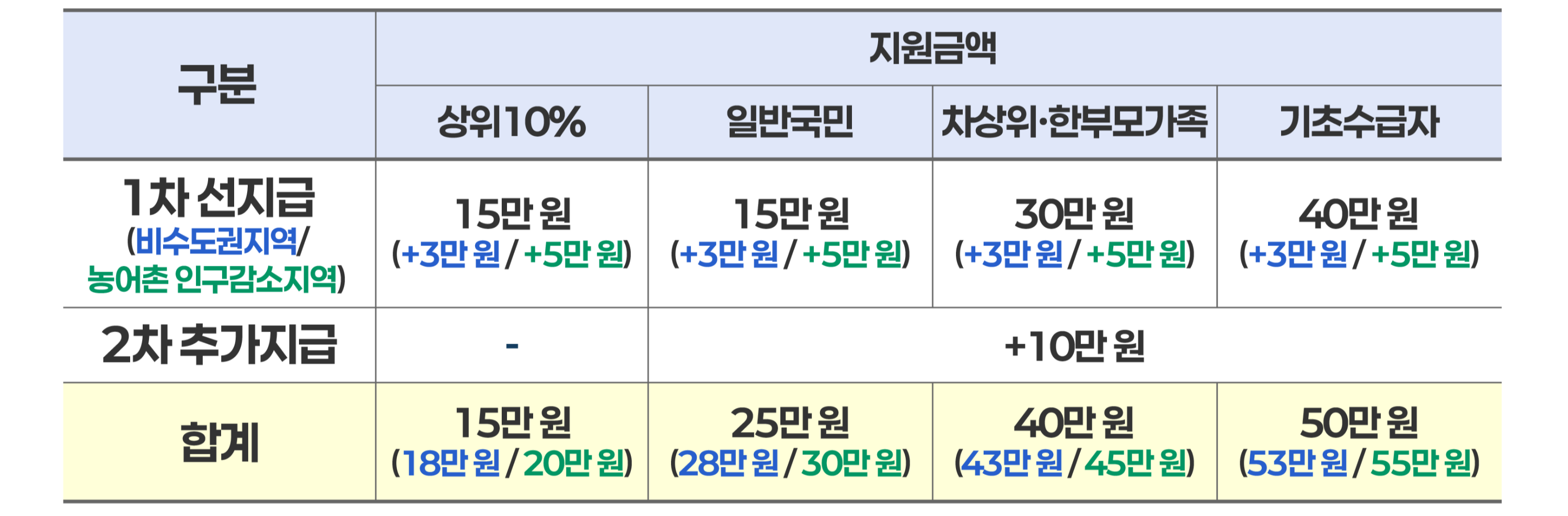 * 농어촌 인구감소지역(84개 시,군)은 1인당 5만원 추가 지원