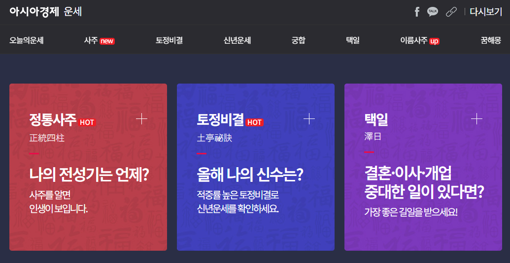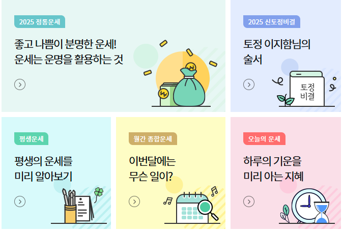 2025년 신년 띠별 운세, 사주, 토정비결, 궁합, 타로 등 다양한 무료운세를 확인할 수 있습니다.