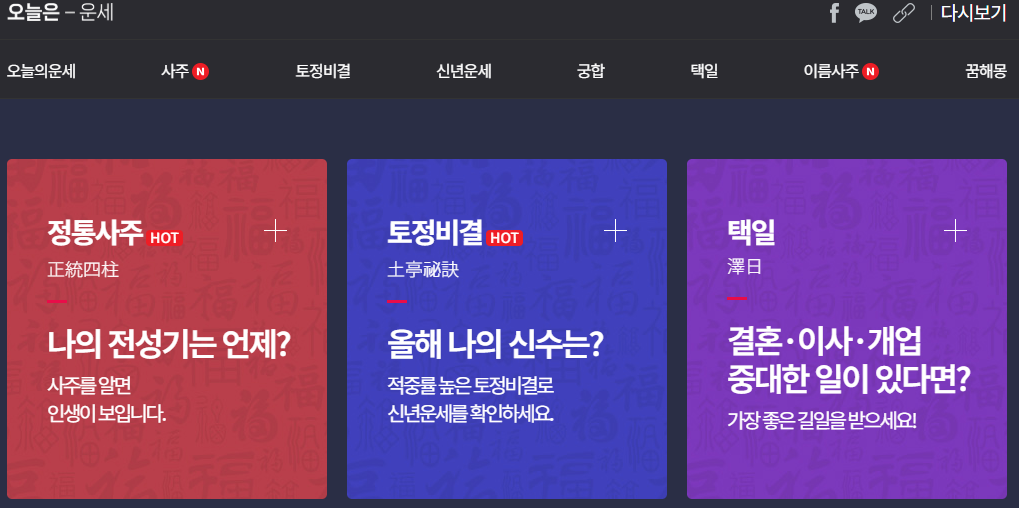 | 2025년 무료운세 사이트 모음(사주, 토정비결, 궁합, 타로 운세) (1) | 2025.01.01 |